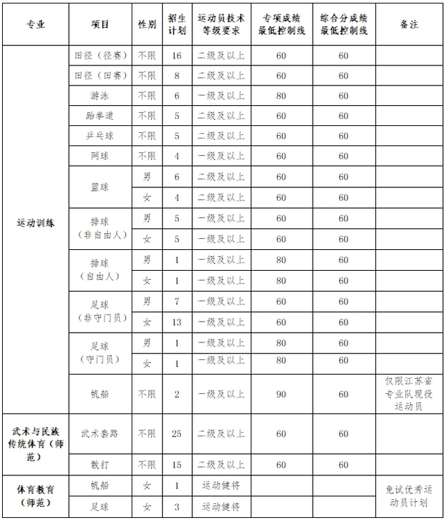 1.运动训练。面向全国计划招生90人。招生项目:田径、游泳、足球(十一人制)、篮球(五人制)、排球、乒乓球、跆拳道、网球、帆船。
