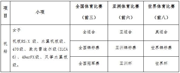 ④帆船项目被授予运动健将称号,且参加下表中所列赛事和小项的最高组别比赛,且取得世界体育比赛前8名,或亚洲体育比赛前6名,或全国体育比赛前3名。